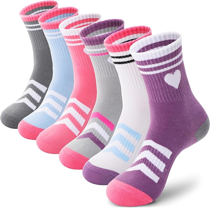 Girls Athletic Crew Socks Kids Cotton Sports Soft Breathable Casual Socks 6 Pairs
