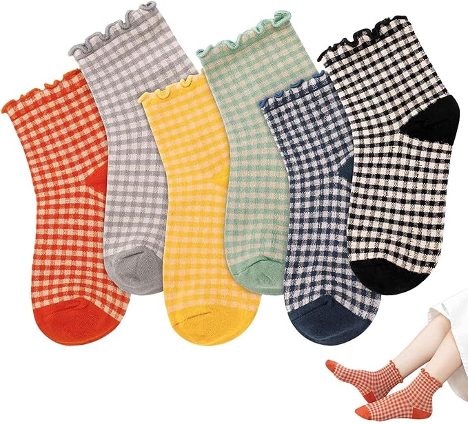 Novelty Socks Cute Ruffle Frilly Striped Socks Cotton Checkered Ankle Socks for Women and Girls