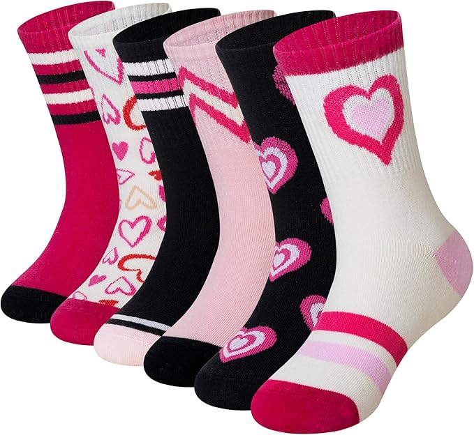 Girls' Rainbow Stripes Hearts Smiley Face Crew Socks 6 Pack